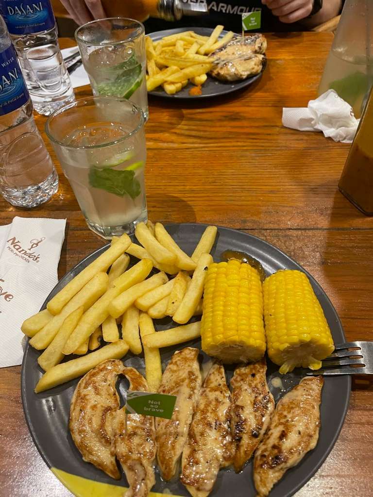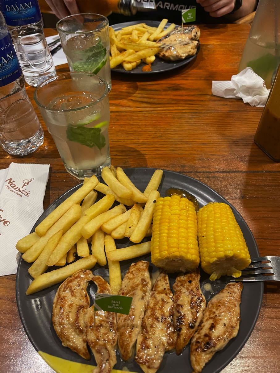 Efter lunchen kÀnde vi Äter igen att det inte var vÄr dag, sÄ vi gick tillbaka till hotellet och somnade. Efter den vÀlbehövliga tuppluren pÄ minst 3 timmar kÀnde vi att vi skulle försöka ge oss ut för middag pÄ Nandos, en sydafrikansk kyckling-restaurang som frÀmst Àr populÀr i England. Maten vi fick sÄg lite sorglig ut, men det var faktiskt rÀtt gott. Eftersom det Àr lördag verkar det dock vara peak underhÄllning att gÄ ut och shoppa, sÄ det var otroligt mycket trÀngsel, vilket vi inte heller var redo för, sÄ nu Àr vi pÄ hotellet igen och ser fram emot en till god natts sömn!