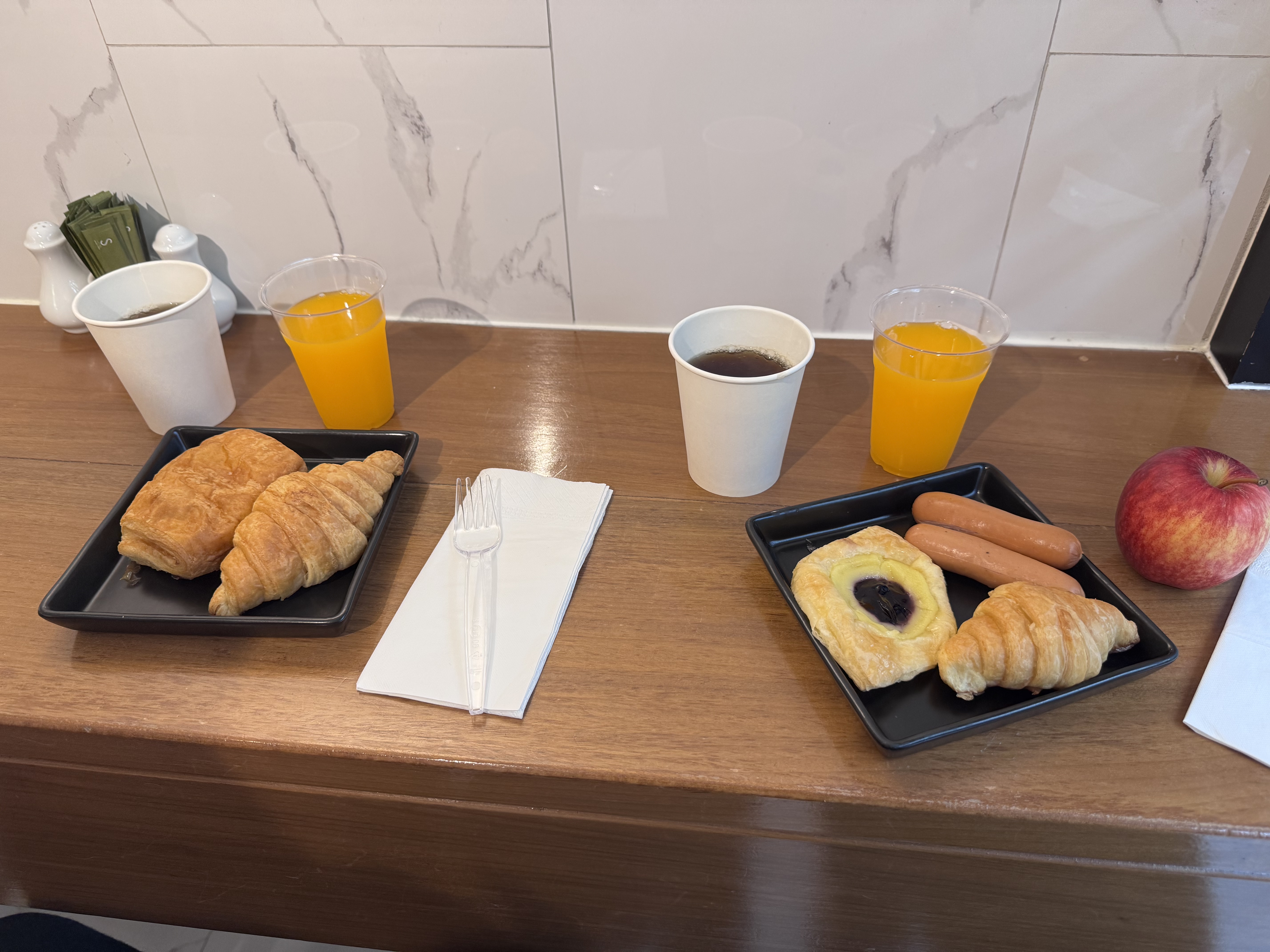 Första heldagen i Bangkok började med 12 timmars sömn, vilket var välbehövligt. På morgonen var det dags för frukost, och vi valde minifrukosten på hotellet. Det fanns en uppgraderad frukost som kostade 300 baht, men det fanns också en gratisfrukost på första våningen där man kunde få allt möjligt trevligt. De hade hot dogs (som de mikrade åt oss!), olika pastries, te och kaffe, och frukt.