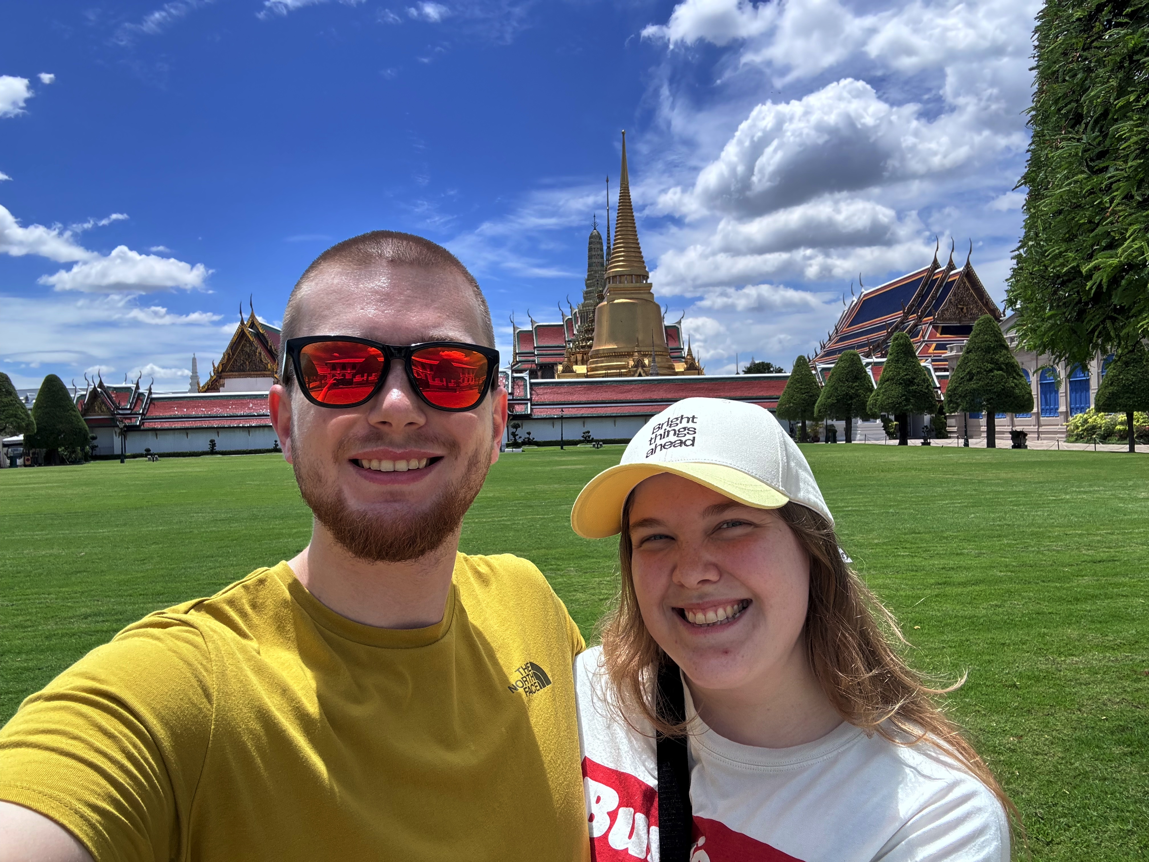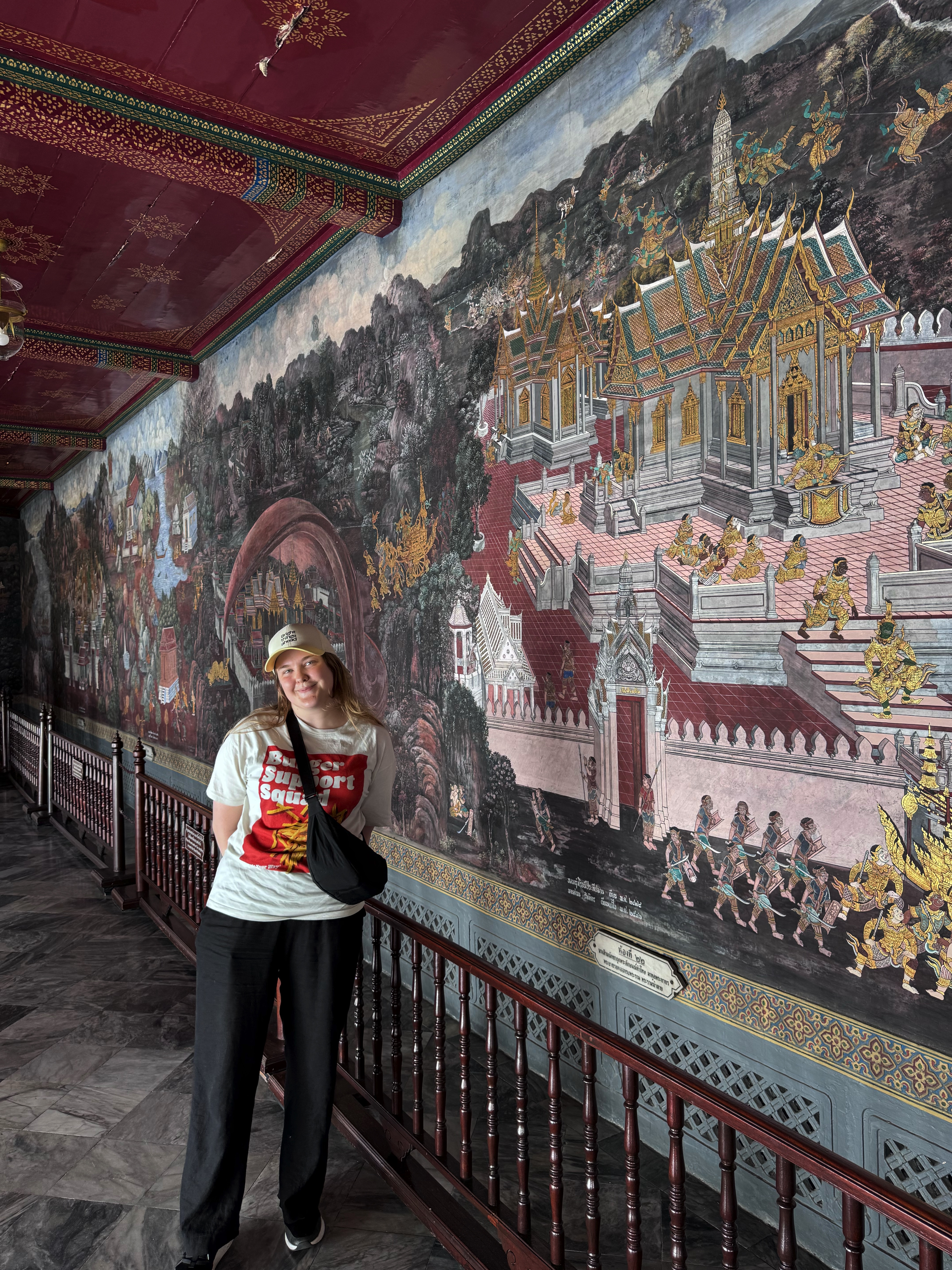 Efter frukosten tog vi en taxi till The Grand Palace och gick runt där. Vi såg väldigt mycket förgyllda och utblingade statyer, byggnader och alla möjliga saker. Det var soligt och varmt med klarblå himmel, så värmen var väldigt påtaglig! Vi kollade också på massor av roliga murals/väggmålningar som gick runt hela första delen av palatset (och dessutom var den i skugga, haha!).