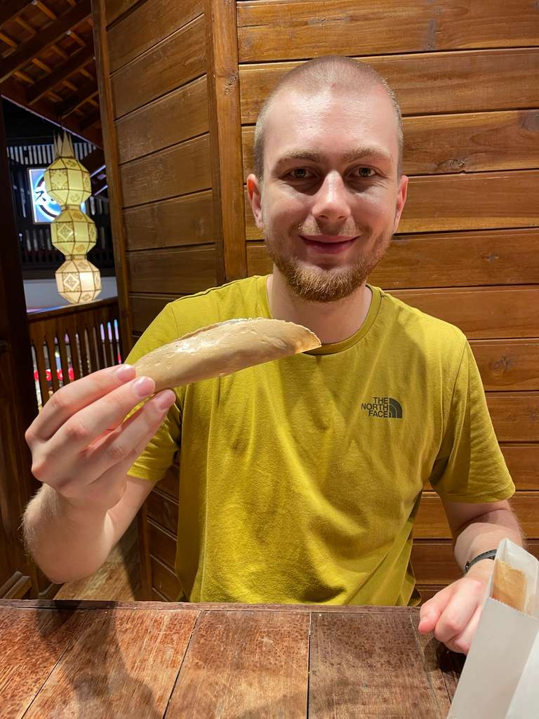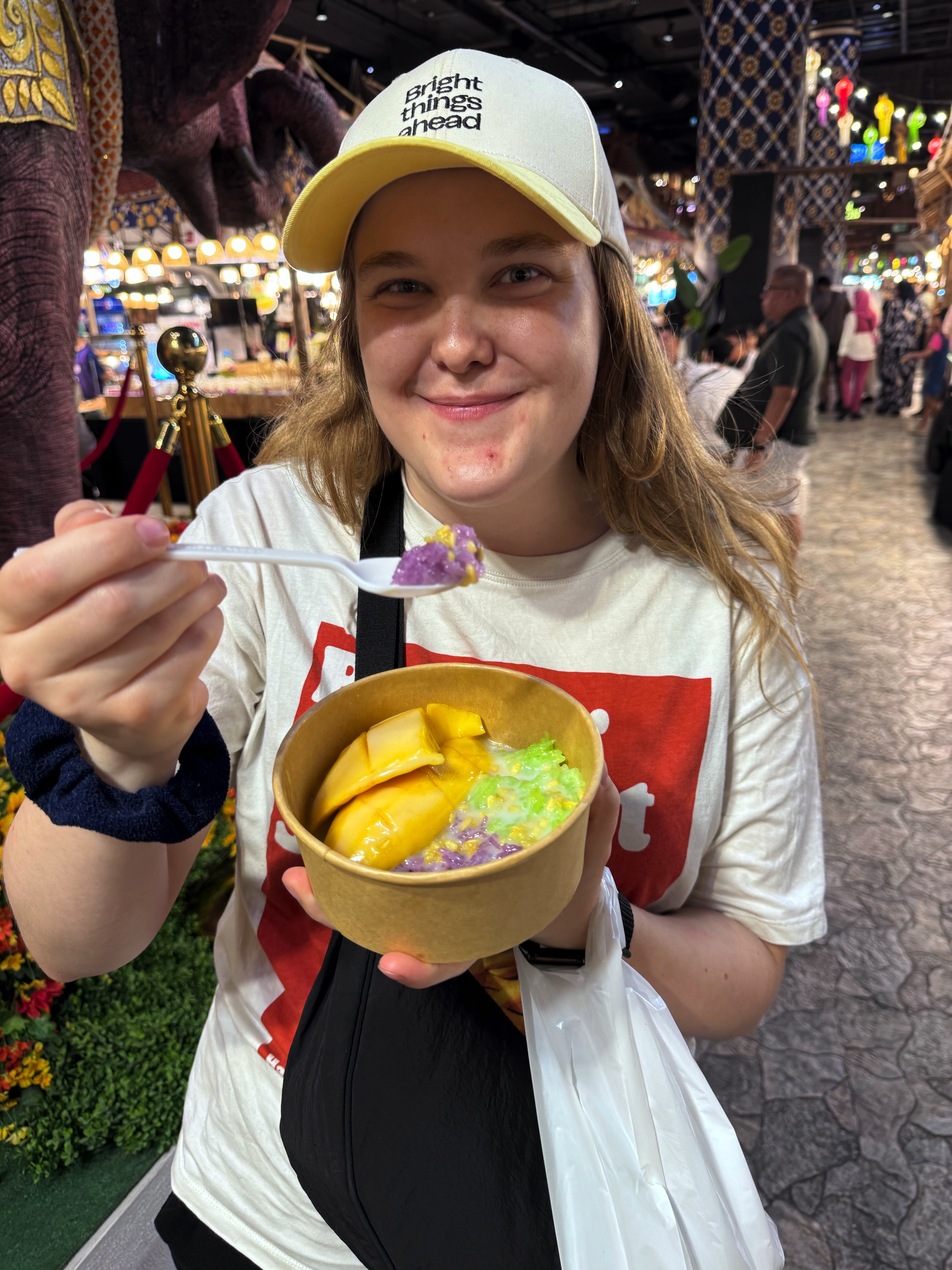 Sen köpte vi mer mango sticky rice, och vi testade även durian! Durian var en upplevelse att prova, det luktar väldigt onice, dock inte lika illa som man trodde, men inte bra. Smaken var väl så där, inget att prova igen. Sen tog vi taxi tillbaka till hotellet vilket tog cirka en timme, Bangkok är enormt med sjukt mycket trafik så allt tar sin tid.