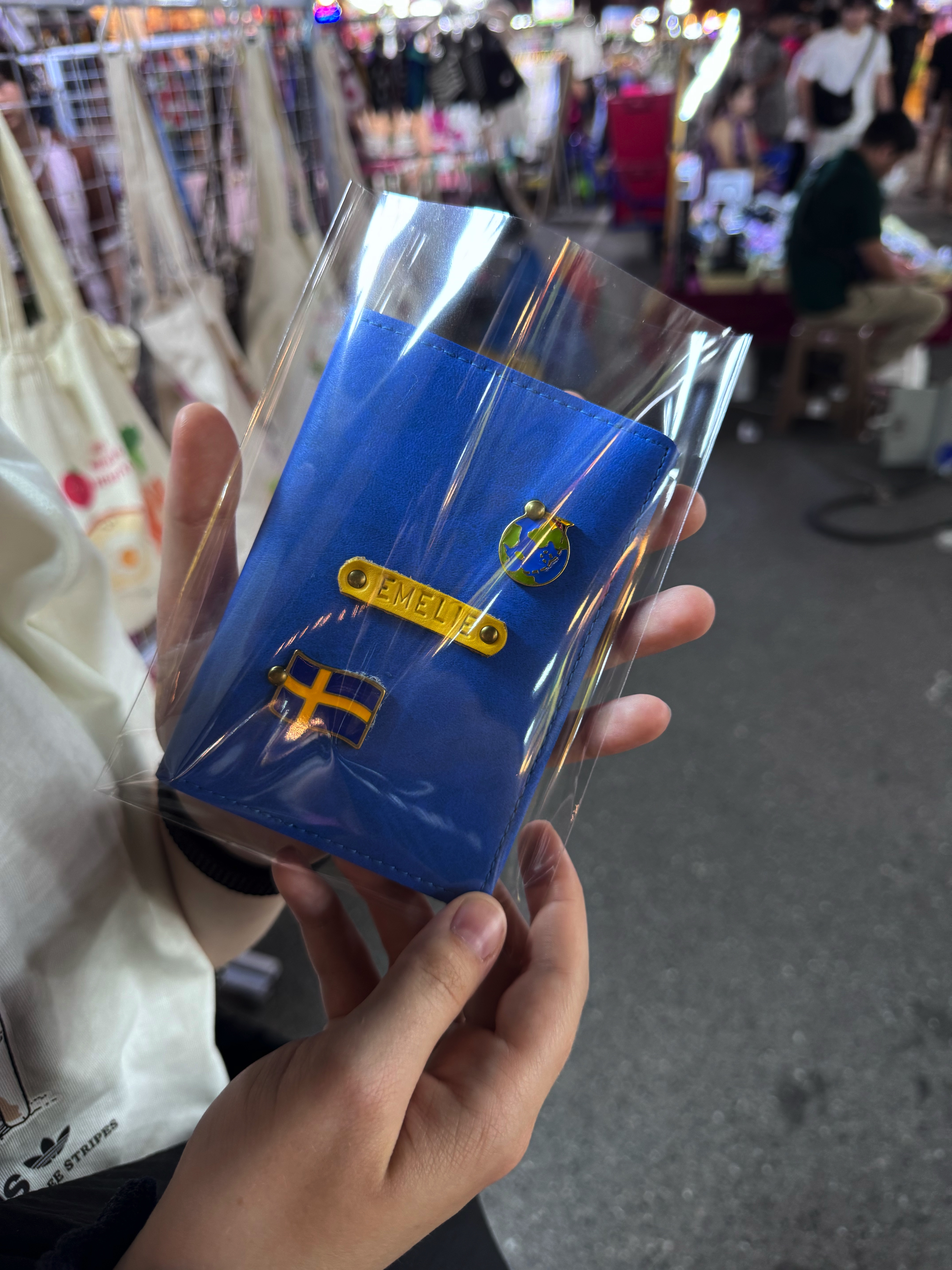 E: Ja! Jag valde en blå bas och lade till charms med Sveriges flagga och en jordglob, och skrev även mitt namn på. Allt för 60 baht??