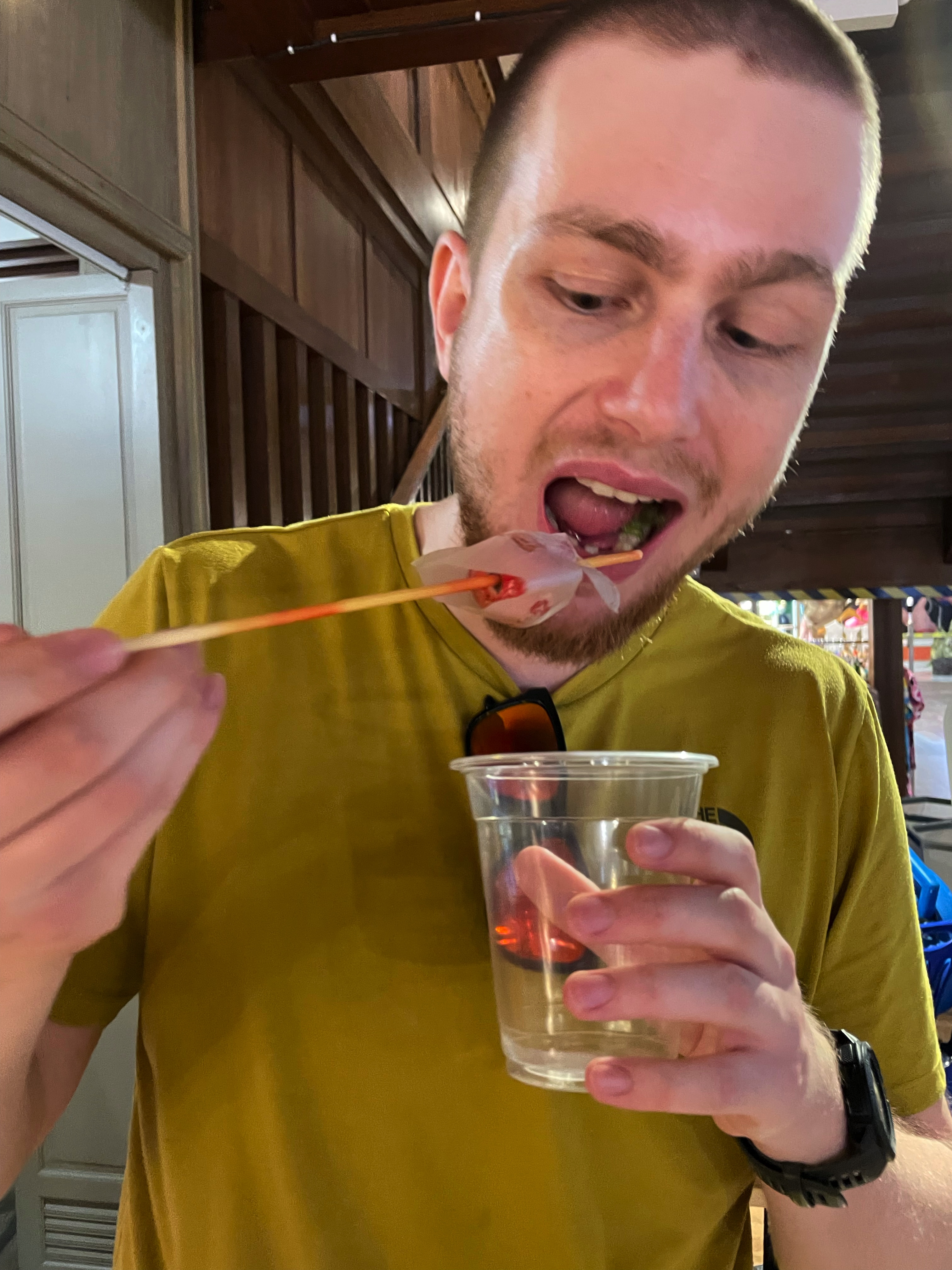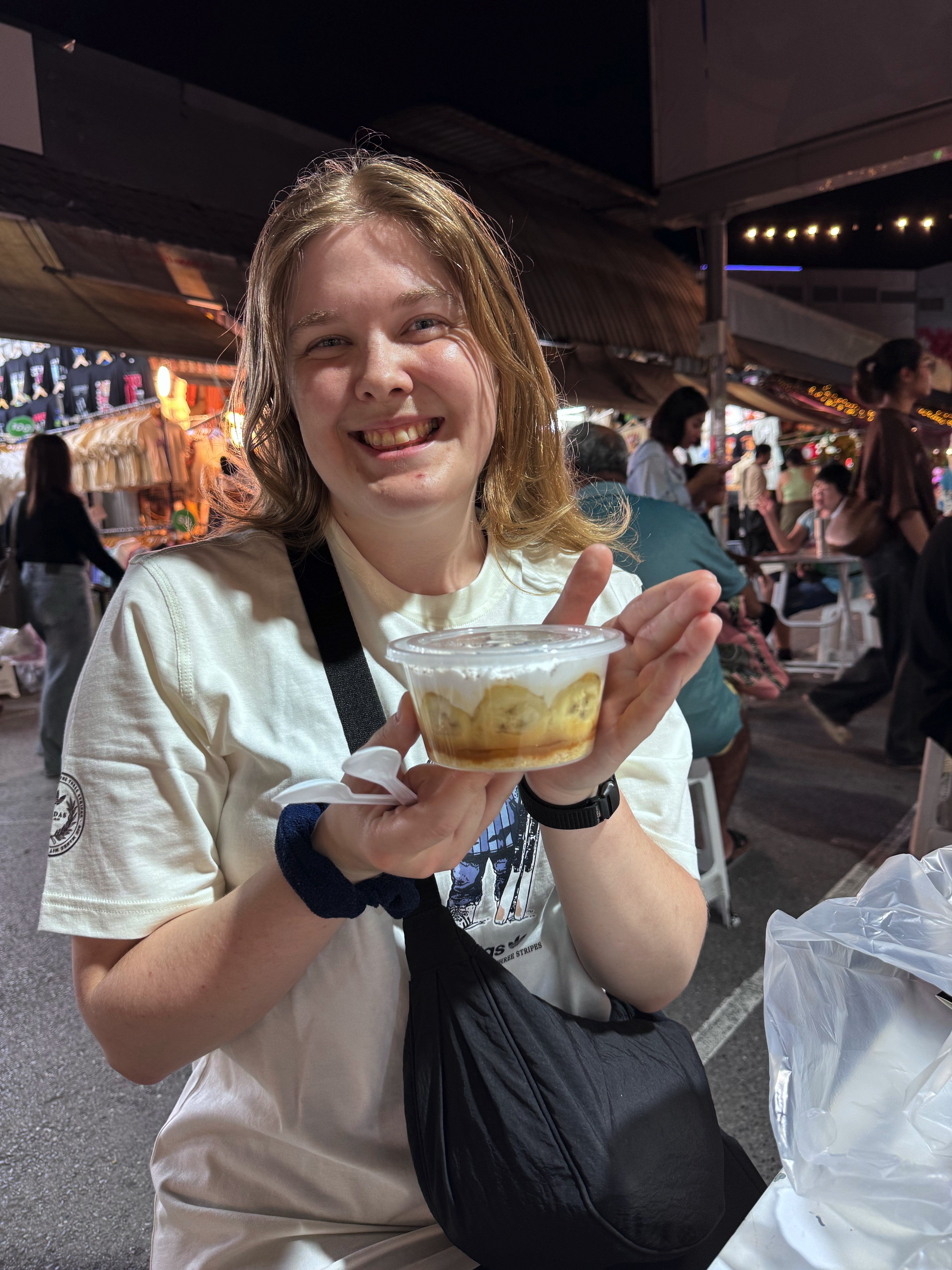 Sedan åt vi Pad Thai och drack mangodryck. Pad Thai smakade precis som hemma – ingen skillnad alls, precis som Ludvig skrev på sin blogg redan 2017. Till efterrätt köpte vi banoffee pie i små burkar, den hade varit perfekt om den varit kyld, men för priset (ca 20 kr) var den ändå värd det. Vi avslutade kvällen med en Singha Light-öl och åkte sedan tillbaka till hotellet med tåget, vilket var smidigt och billigt (ca 13 kr för en halvtimmes resa).