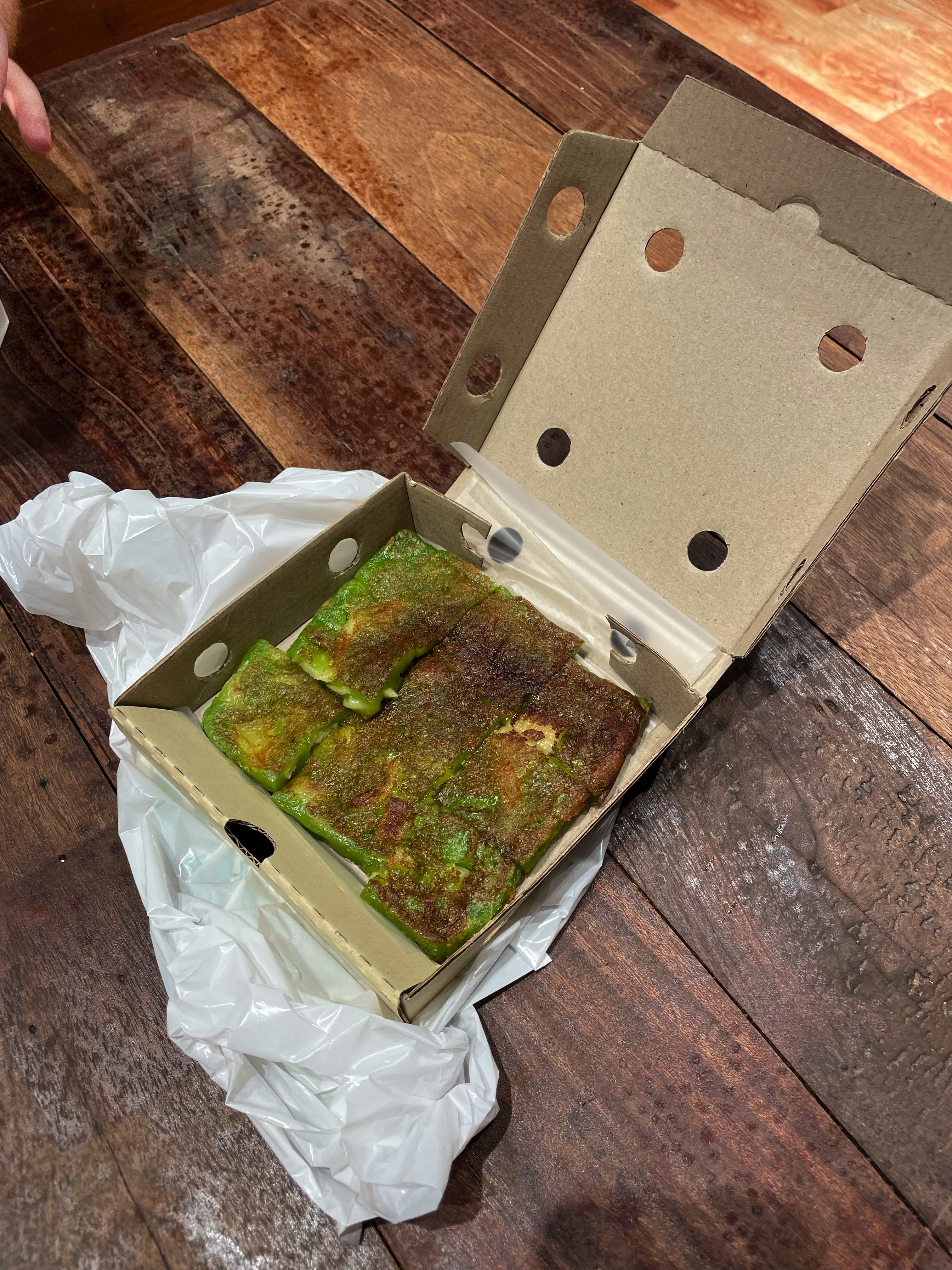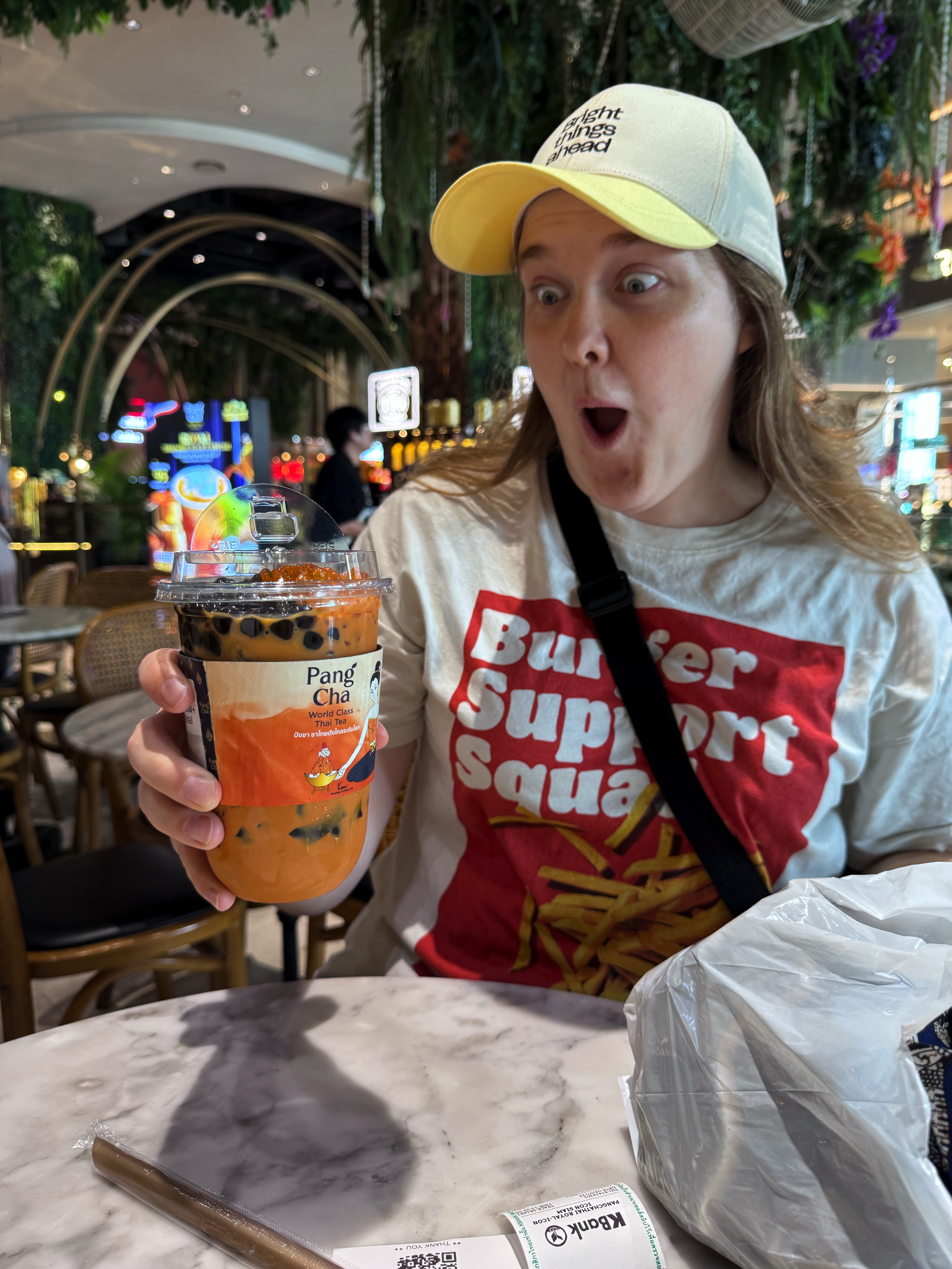 Vi köpte också små crepes med lite blandad fyllning, en grön kokospannkaka som var god, och ett fruktspett med kanderade jordgubbar och vindruvor. Sen gick vi och köpte en Thai Ice tea med boba - det var en crossover!