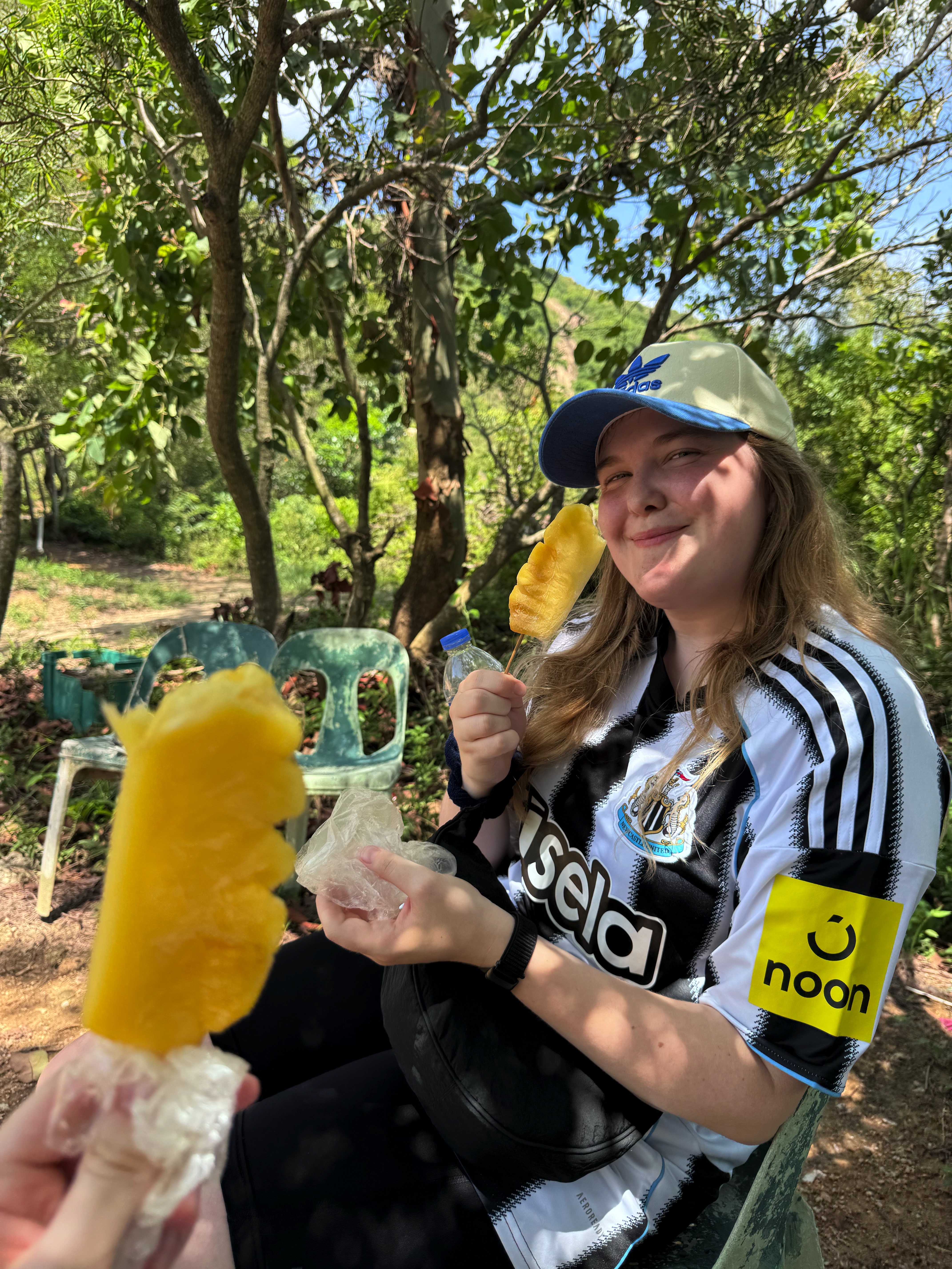 Därefter tog vi bussen ner till city och köpte lite souvenirer. Vi väntade sedan på en båt som skulle ta oss till Lamma Island, en ö ungefär 30 minuter med båt från Hongkong. På Lamma Island gick vi över ön från piren Sok Kwu Wan till piren Yung Shue Wan, en vandring som tog ungefär en och en halv timme. På vägen köpte vi en frusen mango och en frusen ananas, båda väldigt trevliga. Vi köpte också rejält med vatten eftersom det var väldigt varmt och vi svettades konstant.