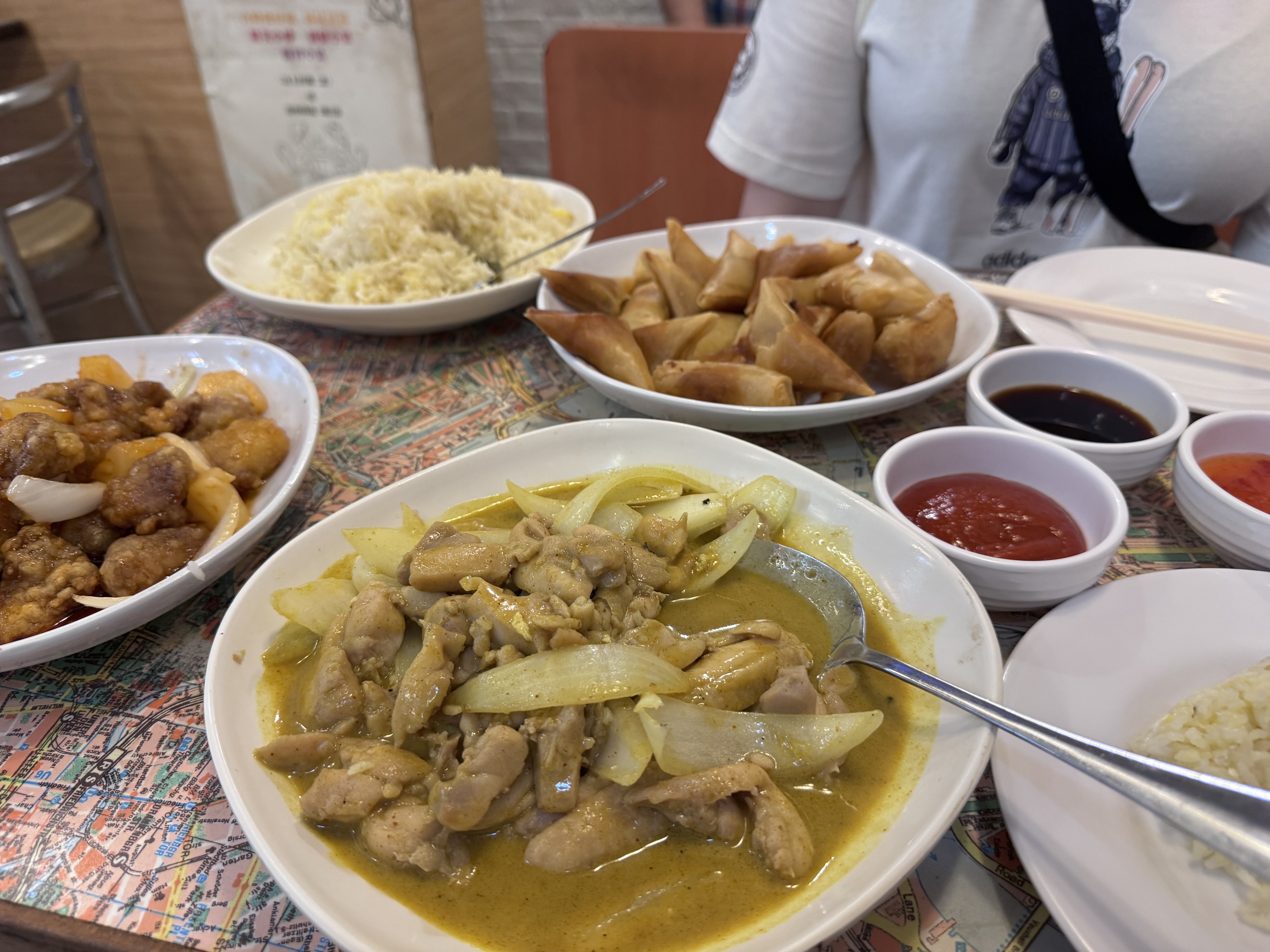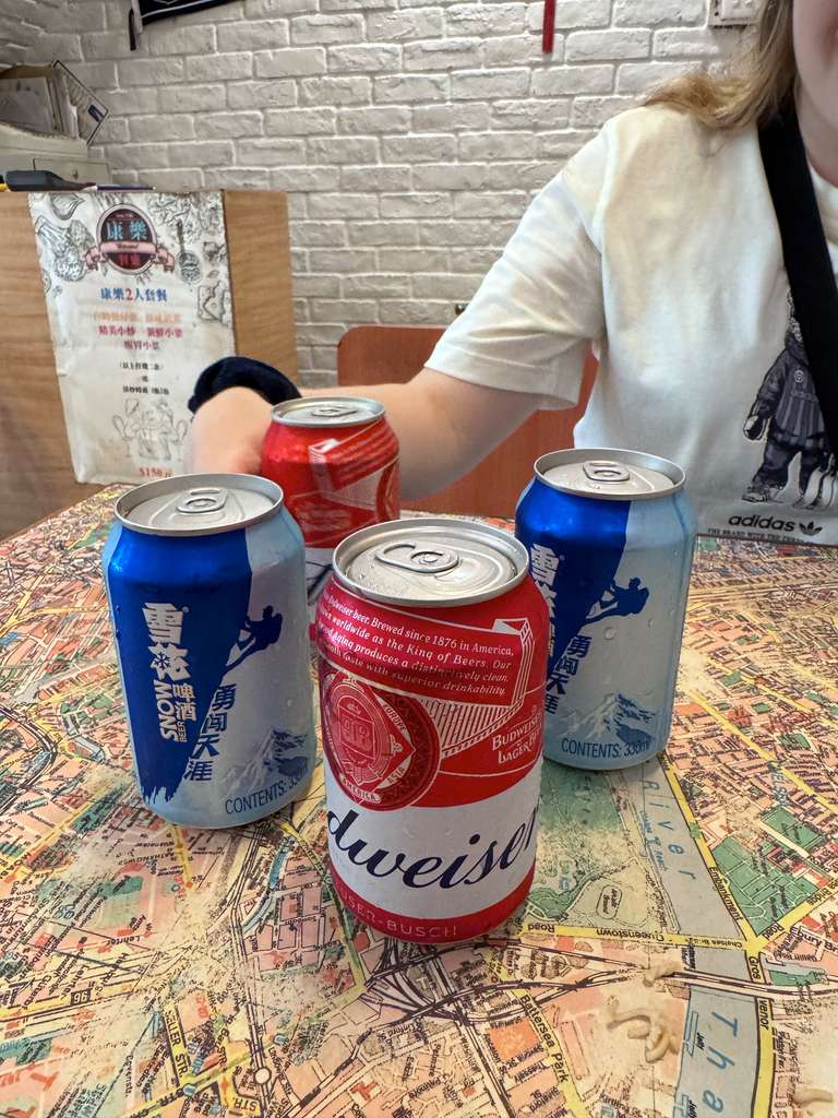 Efter ett kort stopp på hotellet åkte vi till Mr Wongs restaurang. Det var en spännande upplevelse där man inte beställer något utan bara säger att man vill äta och de sade "ok". Sedan kom det ölburkar och tallrik efter tallrik med mat! Vi åt fried rice, vårrullar, biff och broccoli, fläsk i någon sötsur sås, och en currykyckling. Det var ganska enkelt men väldigt gott. De kom även in med fyra burkar öl till, men det orkade vi inte med. Vi hade redan druckit fyra öl och det räckte!