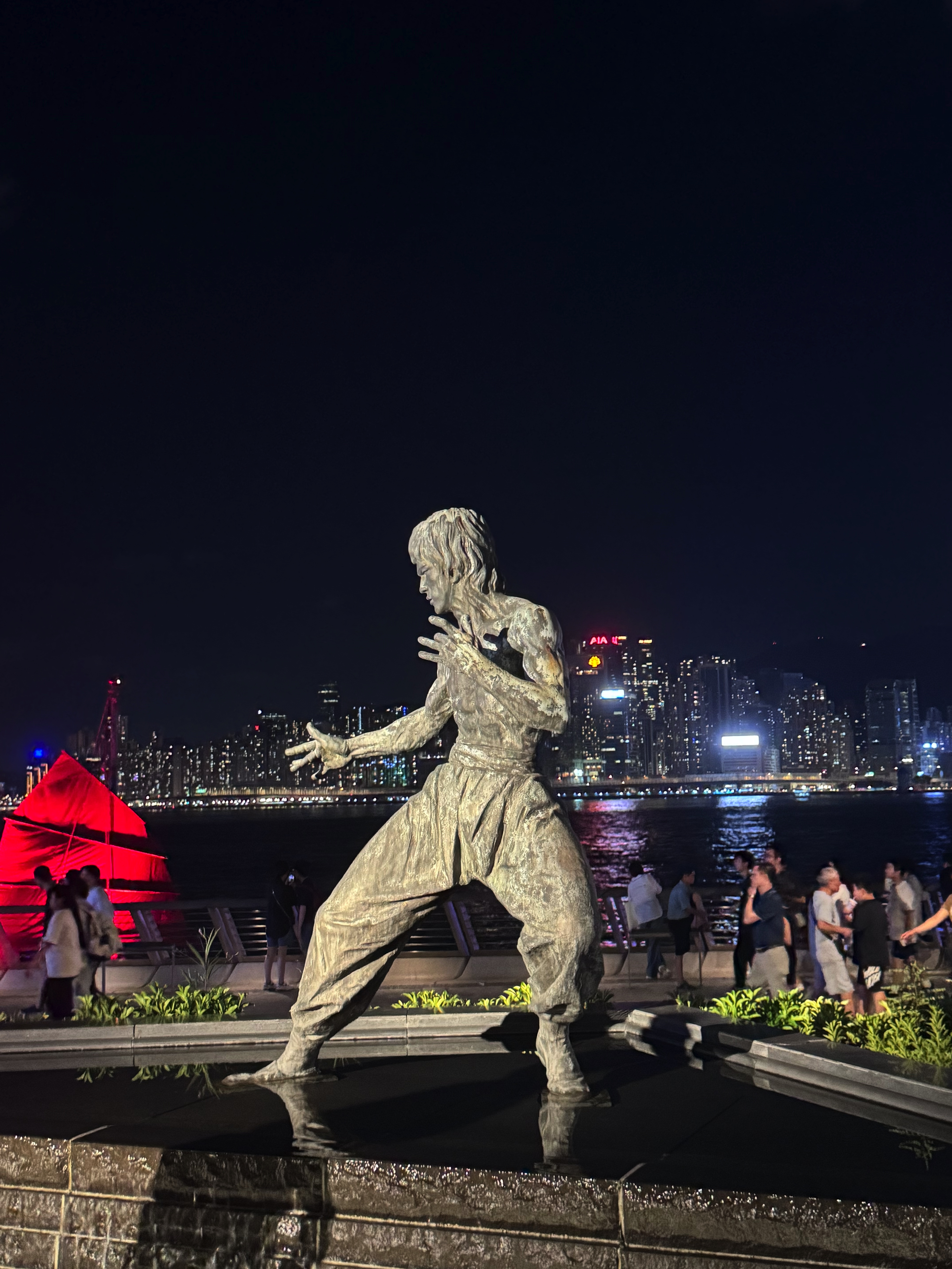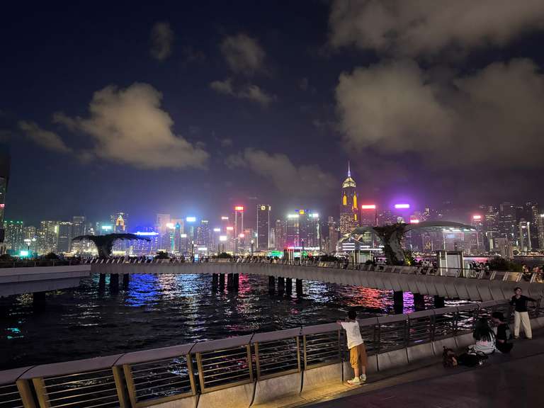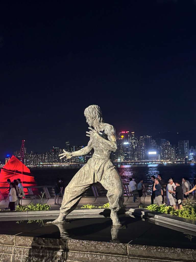 Efter ljusshowen gick vi längs med vattnet och kom till slut fram till Bruce Lee-statyn, men då var vi väldigt trötta och bestämde oss för att åka tillbaka till hotellet. Uber var ganska dyrt, så vi tog tunnelbanan och kombinerade det med att åka en ding-ding! Nu är vi tillbaka på rummet och det är dags att sova. Det har varit en väldigt lång och händelserik dag, men nu orkar vi inte skriva mer eftersom vi behöver göra oss redo för ÄNNU en lång och händelserik dag imorgon - då blir det Macao!