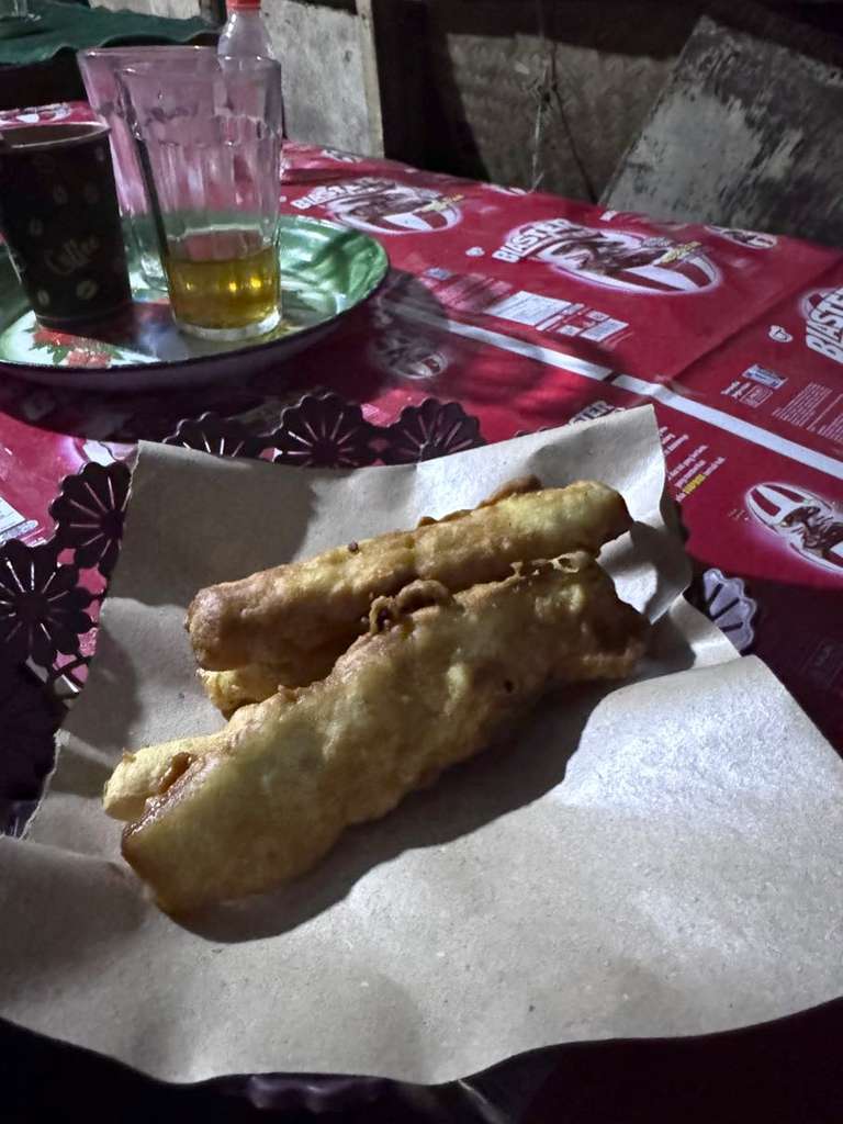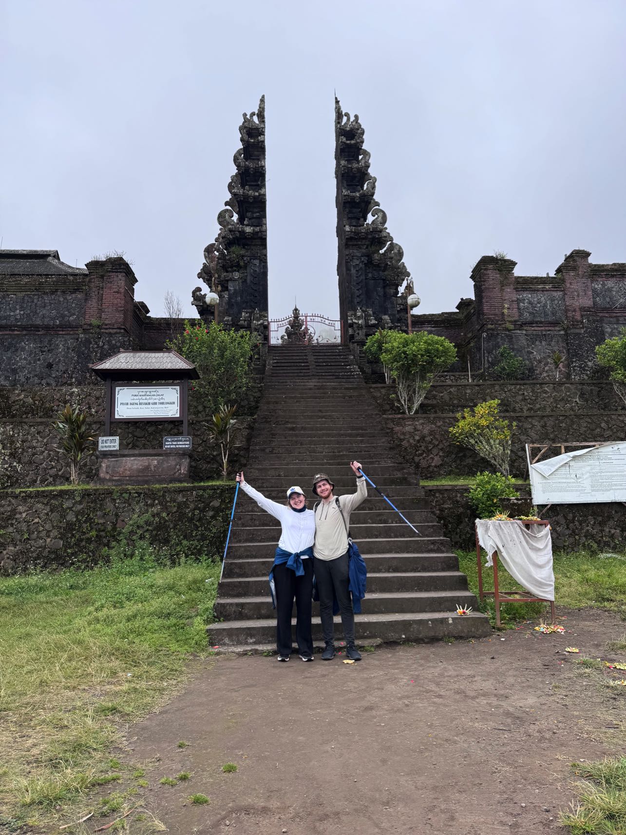 Klockan 11 blev vi upphÀmtade i en bil hÀr vid hotellet av vÄr chaufför. Vi skulle bli körda upp till Pasar Agung-templet dÀr vandringen skulle utgÄ frÄn, den lÄg pÄ cirka 1500-meters höjd. VÀl dÀr fick vi varsin kopp te och friterade bananer. Det var en trevlig start pÄ det hela! Vi fick ocksÄ alla snacks som vi skulle ta med upp, det var sÄ mycket. Ludvig hade bara den lilla ryggsÀcken, men vÄr chaufför kom med en hel stor kasse med grejer och sa: hur ska vi lösa det hÀr? Han hade 6 liter vatten, en liter Coca Cola, 2 pÄsar chips, 2 cup noodles, bananer, choklad, med mera. Det var hur mycket som helst, alldeles för mycket egentligen. Men vi stoppade ner sÄ mycket vi kunde i ryggsÀcken, men det var sÄ mycket som blev över sÄ vÄr guide bar upp en del ocksÄ. Annars hade Emelie behövt bÀra kassen som en ryggsÀck och det kÀnde vi nu i efterhand att det var sÄ skönt att slippa.