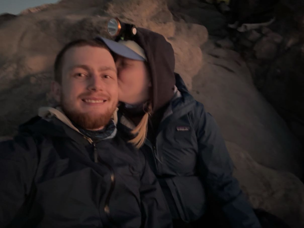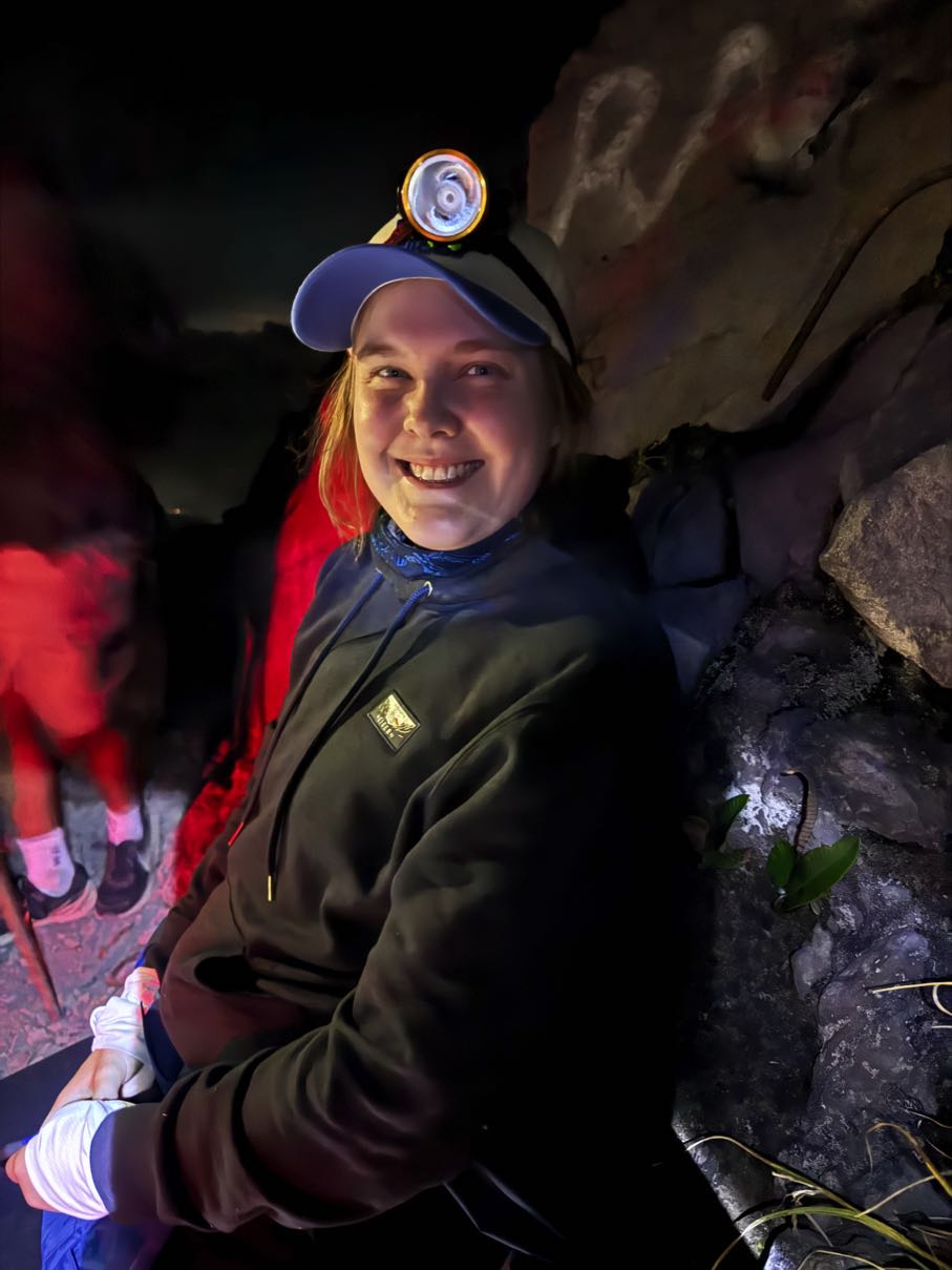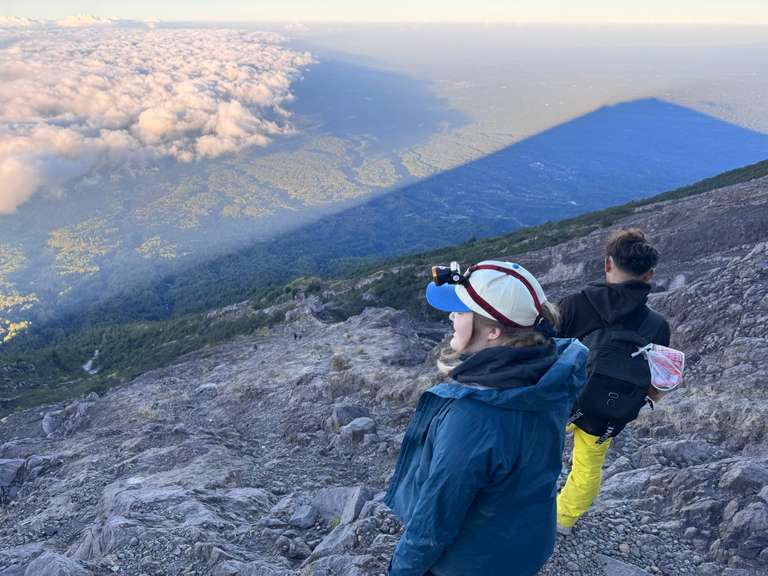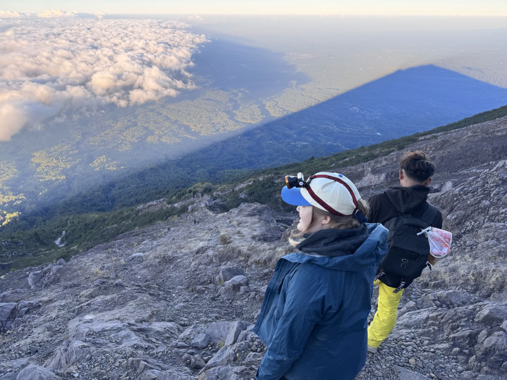 Sedan började den lÄnga vÀgen nedÄt, som ju Àr en helt annan typ av utmaning Àn vÀgen upp. Uppför var det konditionen och lÄren som sattes pÄ prov, men nedför blev det en teknisk och mental prövning. Redan pÄ vÀgen upp hade vi undrat hur vi ens skulle ta oss ner frÄn de branta partierna. Emelie frÄgade till och med vÄr guide vid ett tillfÀlle: "How do you get down from here?" Han bara skrattade. Han förstod sÀkert inte, men det kÀndes himla talande. Till en början gick det ovÀntat bra, de mest skrÀmmande klÀttringspartierna visade sig vara hanterbara i dagsljus. Skillnaden var enorm: pÄ vÀgen upp sÄg vi bara pannlampans ljuskÀgla, men pÄ vÀgen ner kunde vi se omgivningen. Vi upptÀckte lavakanaler och dramatiska formationer vi helt missat pÄ natten.