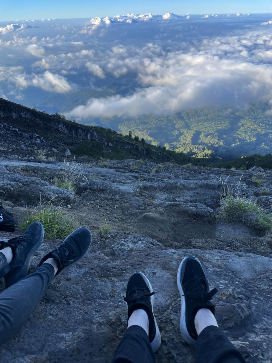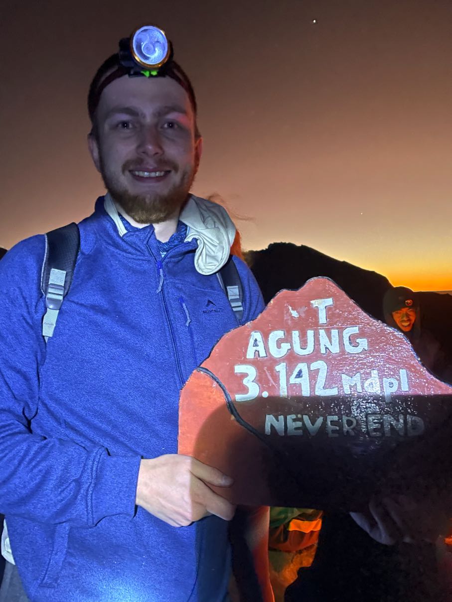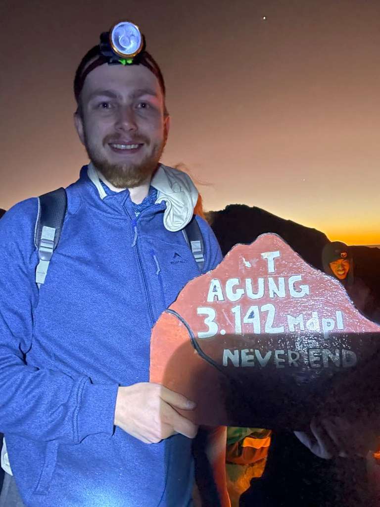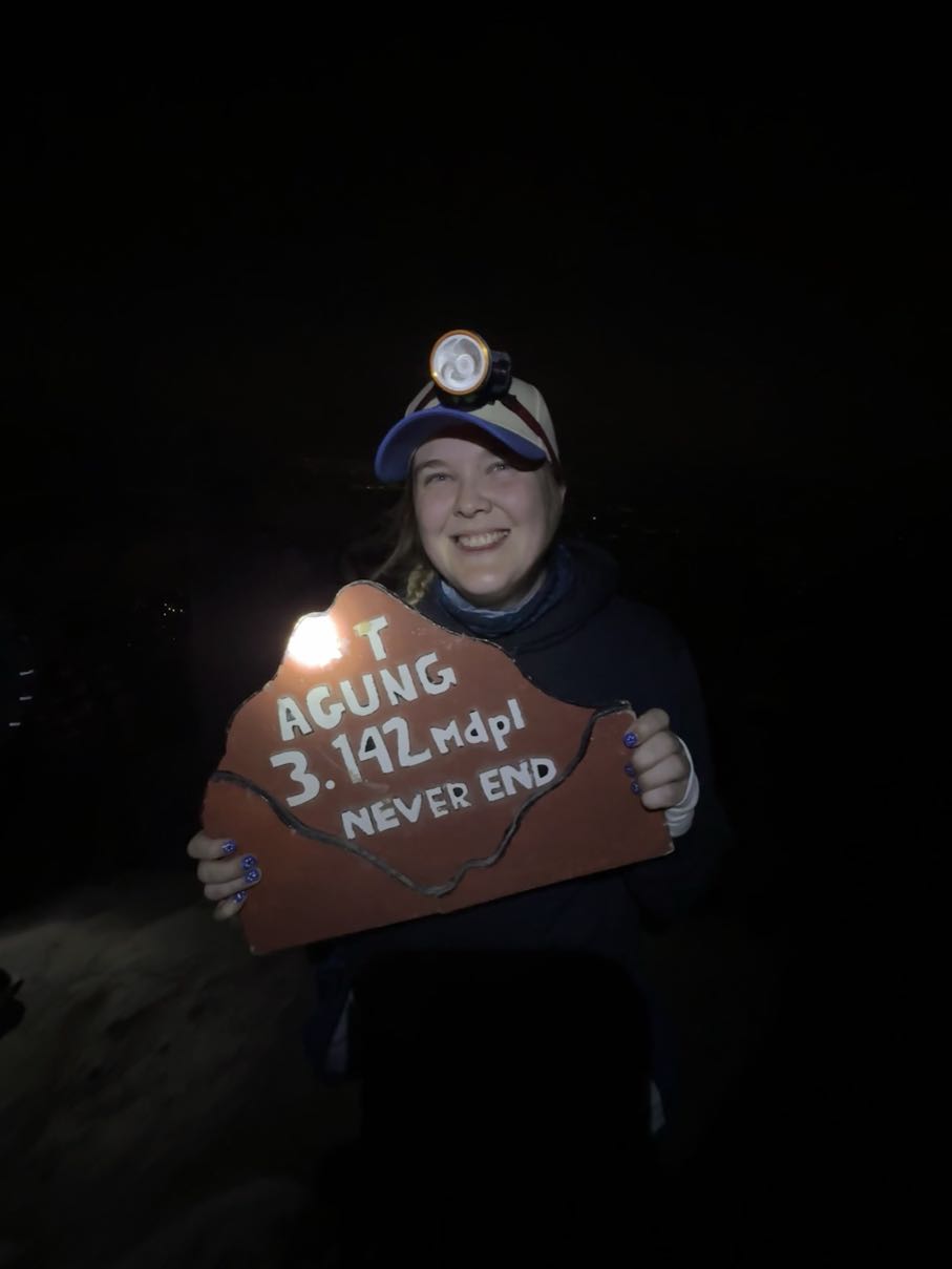 Men plötsligt var vi bara dÀr pÄ toppen. En skylt gick runt dÀr det stod "Mt Agung 3.142 Mdpl - Never End", som beviset pÄ att vi hade nÄtt mÄlet. Vi fick banan, cup noodles och te, och utsikten bredde ut sig i rött och gult mot horisonten medans solen började gÄ upp. Det kÀndes overkligt, nÀstan som en feberdröm i tröttheten. Bilderna gör inte platsen rÀttvisa, det var sÄ mycket mÀktigare i verkligheten (som vanligt). Vi hade pratat om huruvida det skulle kÀnnas vÀrt det, och Àven om svaret fortfarande Àr osÀkert, sÄ Àr det ÀndÄ otroligt hÀftigt att ha klarat det. Nu Àr det gjort, det gÄr inte att ta ifrÄn oss!!