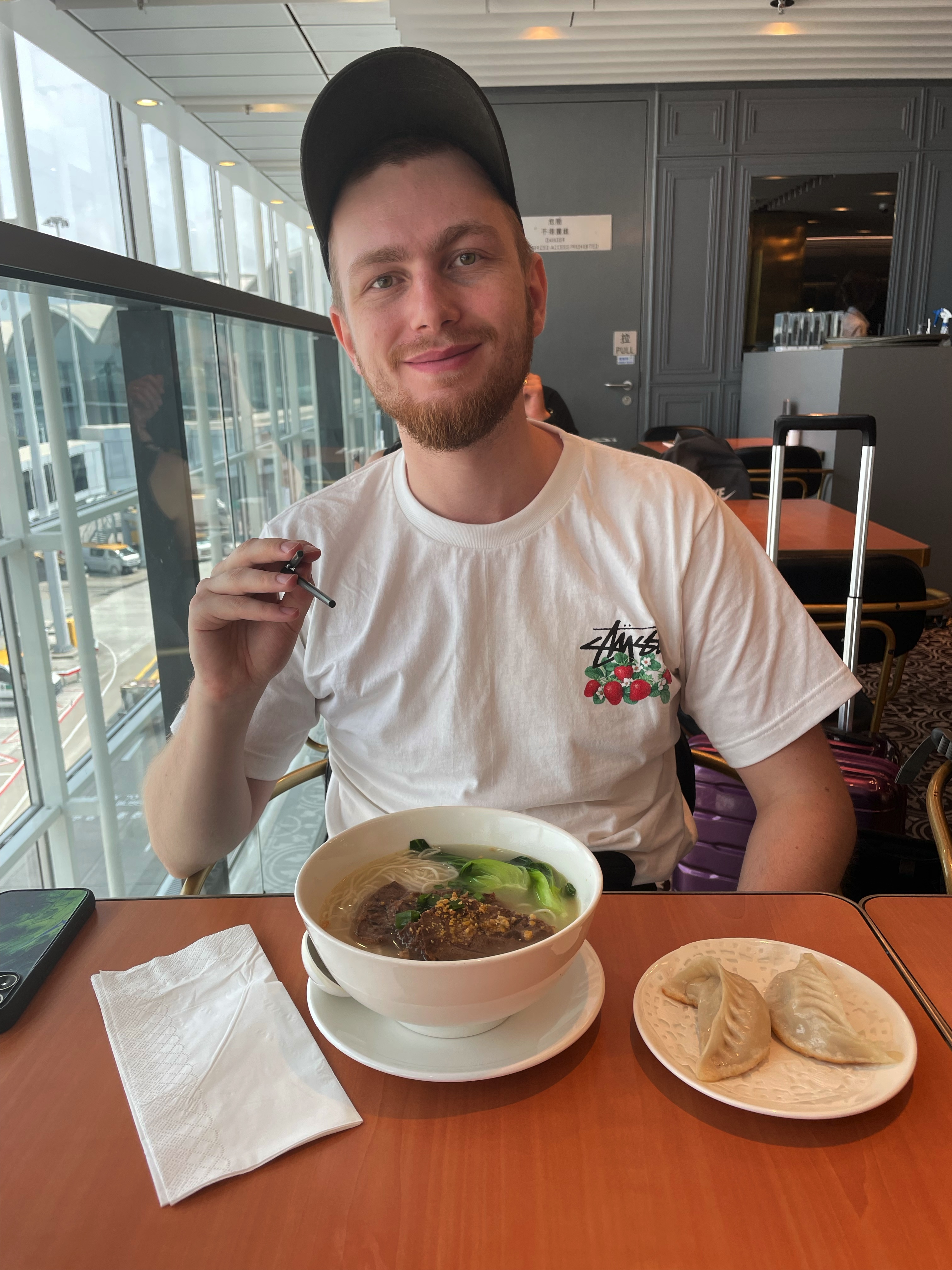 Efter att ha checkat in bestämde vi oss för att äta frukost, eftersom klockan nu var 10 och vi inte hade ätit något. Vi hittade en restaurang som verkade bra och som serverade frukost-paket. Emelie valde shanghai-style pannkakor och dumplings i buljong, medan Ludvig tog nudlar med biff och stekta dumplings. Det var väldigt gott, och det roliga var att totalen för notan gick på nästan exakt så mycket kontanter vi hade kvar - 246,40 Hongkongdollar. Vi hade 248 dollar, så det kunde inte ha blivit mer perfekt.