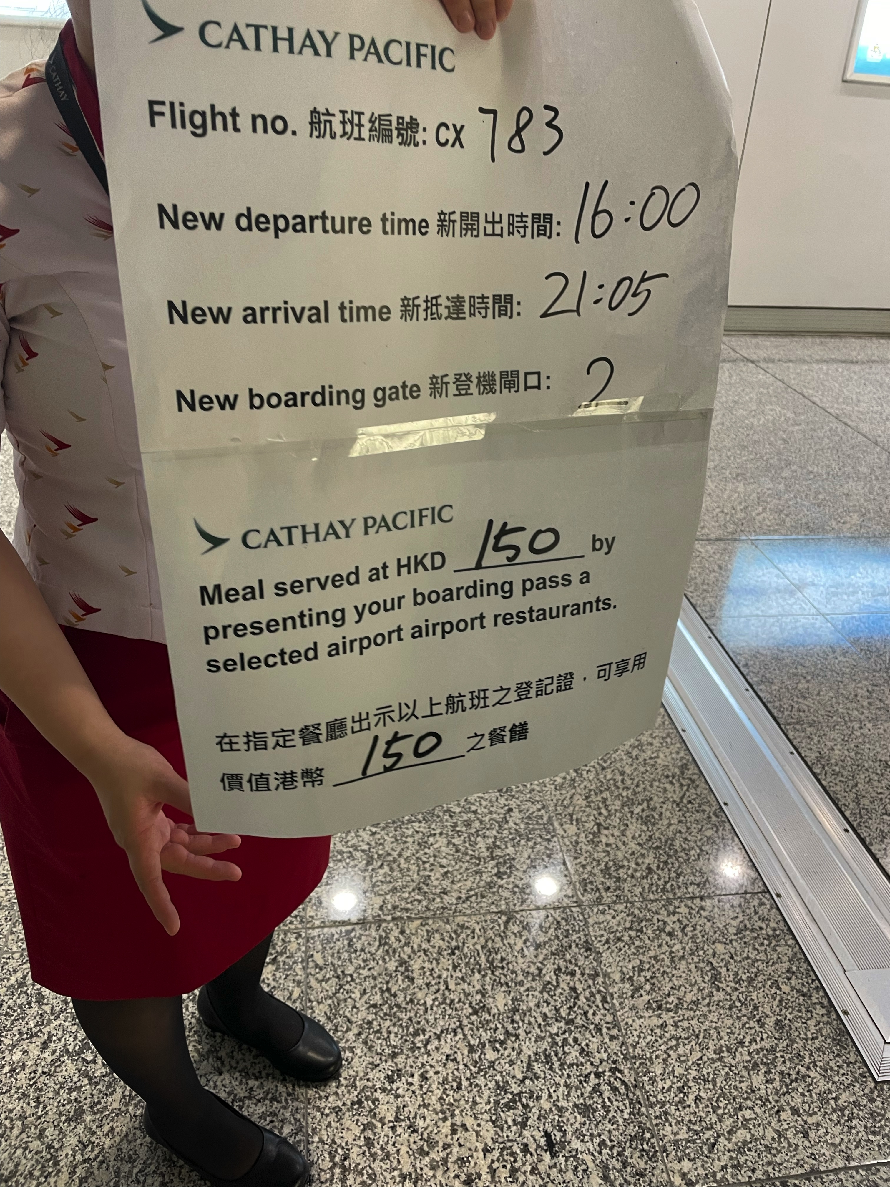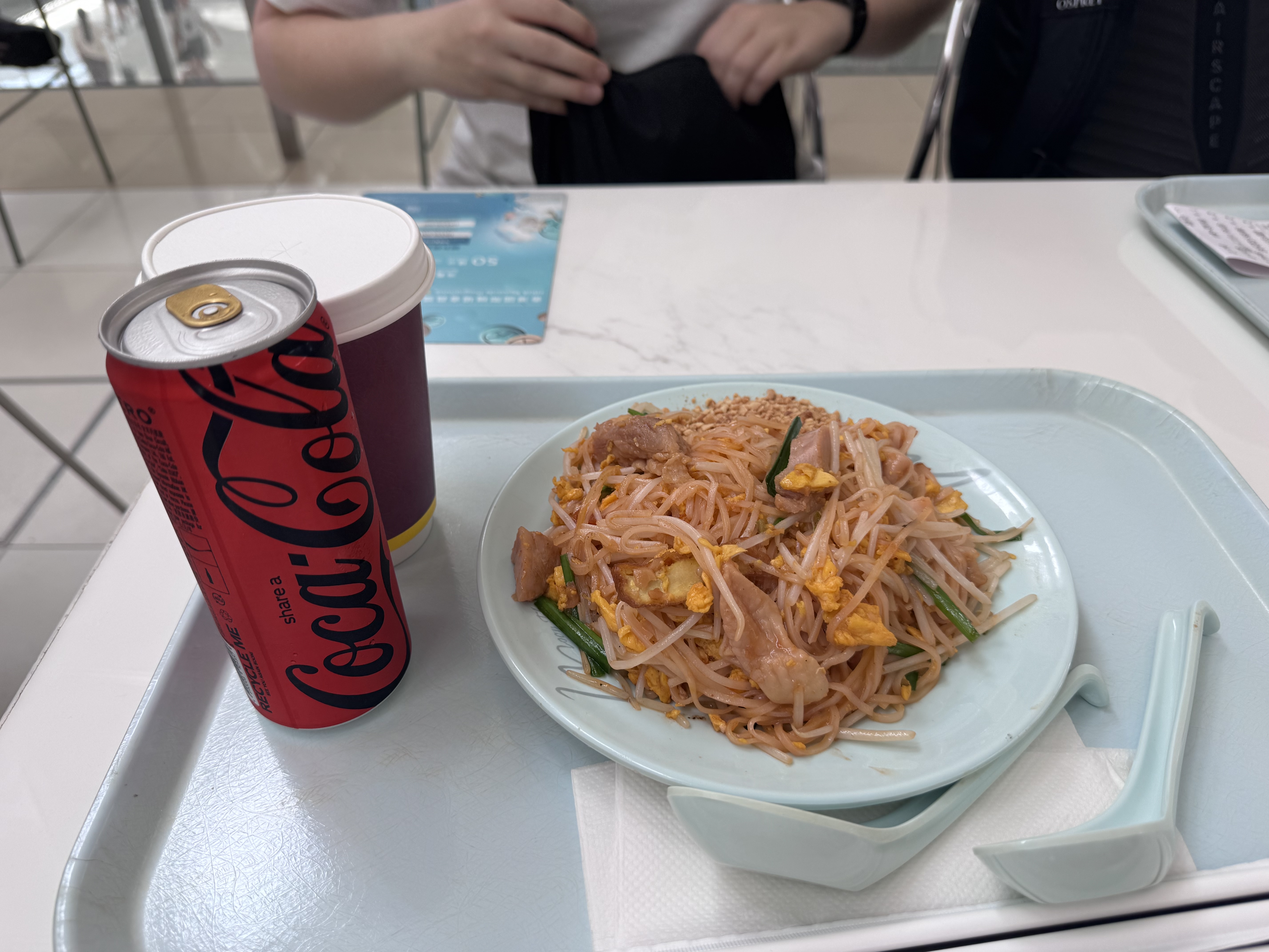Efter frukosten satte vi oss vid gaten och väntade på boarding. Allt gick smidigt fram tills vi var på väg att lyfta. Piloten meddelade att de hade tekniska problem och att de behövde kolla med ingenjörerna vid gate:en. Efter ungefär en timme på flygplanet fick vi veta att vi skulle behöva gå av och byta flygplan. Vi fick också veta att vi skulle flyga klockan 16 istället för halv ett, och att vi skulle få 150 Hongkongdollar i vouchers som kompensation. Vi utnyttjade vouchers:en och åt Pad Thai. Det var en lite konstig version av Pad Thai, men den var gratis.